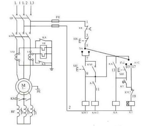 按下啟動(dòng)按鈕SB1,接通接觸器KM1,將電動(dòng)機(jī)接上電源,轉(zhuǎn)子電路串入頻敏變阻器Rfs這時(shí)頻敏變阻器的等值電阻與電抗的值都很大,限制了啟動(dòng)電流并提高了啟動(dòng)轉(zhuǎn)矩。時(shí)間繼電器KT接通后,經(jīng)過一段時(shí)間以后,它的延時(shí)閉合的常開觸點(diǎn)閉合,接通中間繼電器KA。這時(shí),電動(dòng)機(jī)已經(jīng)啟動(dòng)加速一段時(shí)間,頻敏變阻器的等值電阻與電抗也很小了。KA的動(dòng)合觸點(diǎn)閉合接通接觸器KM2,它的動(dòng)合觸點(diǎn)閉合將頻敏變阻器短接,啟動(dòng)過程遂告結(jié)束。
