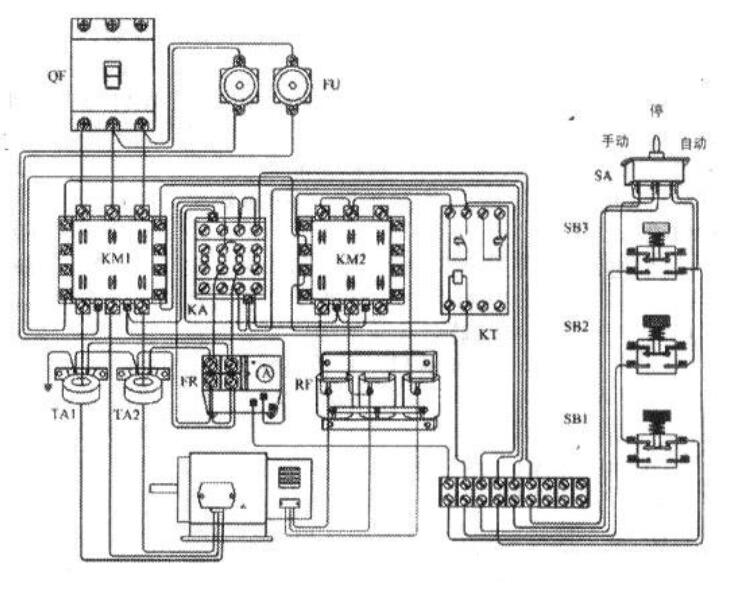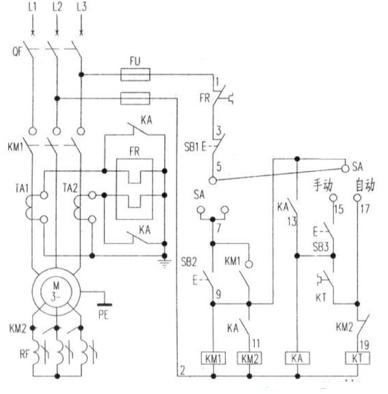 2.手動(dòng)控制。(l)合上空氣開(kāi)關(guān)QF接通三桐電源。(2)將SA搬至手動(dòng)位置。(3)按下啟動(dòng)按鈕SB2.接觸器KM1線圈得電,吸合并自鎖,主觸頭閉合電動(dòng)機(jī)帶頻敏變阻器啟動(dòng)。(4)待轉(zhuǎn)速接近額定轉(zhuǎn)速或觀察電流表接近額定電流時(shí),按下按鈕SB3中間繼電器KA線圈得電吸合并自鎖.KA的常開(kāi)觸點(diǎn)閉合接通KM2線圈回路.KM2的常開(kāi)觸點(diǎn)閉合將頻敏變阻器短路切除。(5)KA的常閉觸點(diǎn)斷開(kāi),將熱元件接入電流互感器二次回路進(jìn)行過(guò)載保護(hù)。